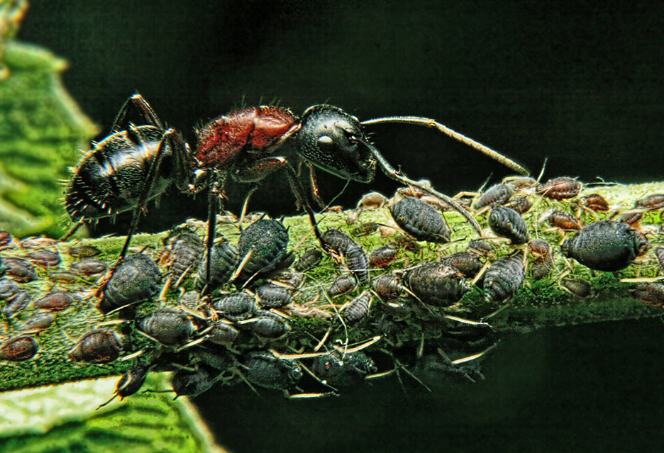 Ants stroke the aphids with their antenna, which causes the aphids to secrete a sugary substance called honeydew, which the ants then eat. In return, the ants protect their aphid buddies from predators. Aphids represent a significant outdoor food source for many types of sugar feeding ants, so the fewer aphids in your garden, the fewer ants you will have.